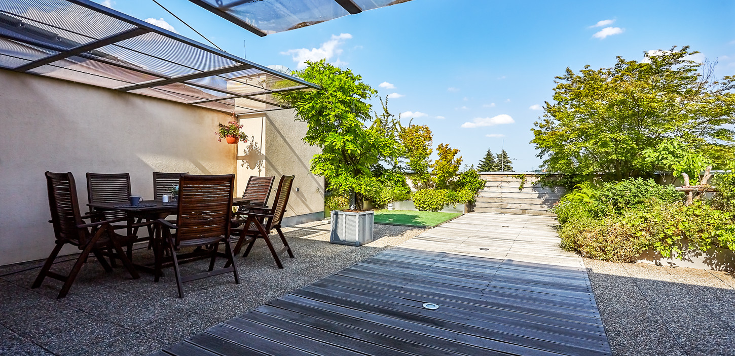 Tak přesně tato slova mě napadají, když si vzpomenu na svoji návštěvu v tomto bytě. Pokud hledáte moderní bydlení na okraji Prahy s velmi dobrou dostupností do centra města, tento byt by mohl být tou pravou volbou pro Vás. Je umístěn v nejvyšším podlaží třípatrového bytového domu Villa Porcellana, který byl v roce 2004 postaven v pražských Dolních Chabrech. Významnou dominantu tohoto obydlí tvoří třiasedmdesáti metrová terasa s pergolou, vzroslými keři a dokonce i s malým stromem. Vnitřní prostor obývacího pokoje a kuchyňského koutu je velmi příjemně prosvětlený prosklenou okenní stěnou s výhledem na východ do zástavby rodinných domů. Na obývací pokoj navazuje další místnost, která je od obýváku oddělena prosklenou stěnou se skleněnými posuvnými dveřmi. Zadní část bytu tvoří ložnice s koupelnou a prostornou šatnou. Zajímavostí koupelny kromě jejího luxusního designového řešení je skleněný průhled do ložnice, díky němuž do koupelny proniká denní světlo. Na podlahách všech obytných místností je položeno masivní černé dřevo. Podlahu koupelny a samostatné toalety u vchodu do bytu zdobí kvalitní vkusná dlažba. Etážové vytápění bytu nahřívá plynový kotel umístěný ve společné domovní kotelně, v níž je ohřívána i užitková voda. K bytu patří i samostatný dvoumetrový sklep a 2 garážová stání v suterénu domu. Měsíční zálohy na energie a fond oprav za 2 osoby činí 6.295,- Kč. Dům byl postaven v původní Dolnochaberské zástavbě rodinných domů evokujicí až vesnický charakter bydlení. Velmi příjemné mohou být procházky v nedalekém Čimickém či Ďáblickém háji, což jsou dva lesy které tvoří přirozenou biohranici Prahy 8. Pokud Vás tento byt zaujal už z fotografií, věřte, že osobní návštěva Vás v tomto pocitu jen utvrdí a do tohoto prostoru a místa se zamilujete. Prohlídku Vám zajistí realitní makléř pan Jan Štěpánek.