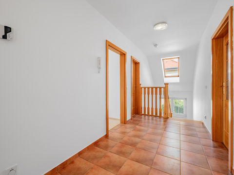 Takto nějak by se ve stručnosti dalo popsat bydlení v tomto obrovském domě na okraji Prahy v Písnici. Dům je to rodinný, má dvě obytná podlaží a je celý podsklepený. Podrobnější přehled uspořádání místností si můžete prohlédnout na přiložených pláncích. Dům byl postaven jako součást developerského projektu v polovině devadesátých let a při podrobném prozkoumání zjistíte, že kvalita provedení je nadstandardní. Centrální část obydlí tvoří obývací pokoj s částečně prosklenou fasádou, který je propojený s jídelnou a kuchyňským koutem. Z obýváku je vstup na terasu, kde si můžete se svou rodinou užívat naprostou pohodu rodinného života. K té Vám v zimních měsících přispěje i atmosféra praskajícího ohněm v krbových kamnech. V suterénu domu je dvou garáž s vraty na dálkové ovládání, kterým otevřete i vjezdovou bránu na pozemek. O vytápění domu a ohřev vody se stará plynový kondenzační kotel. Zajímavostí je i centrální vysavač umístěný v garáži s vývody ve všech podlažích i v kuchyni. V patře jsou tři pokoje, ložnice, šatna a dvě koupelny. Kolem domu je udržovaná zahrada se vzrostlými dřevinami, díky nimž je na zahradě dostatečné soukromí. Za domem je pole, a to zde ještě pár let jistě bude. Velkou výhodou bydlení v Písnici je kombinace života na vesnici s velmi blízkou přítomností velkoměsta. V centru Prahy můžete být autem i za 15 minut (o víkendu), standardně cesta trvá 25 - 40 minut. Momentálně se již připravuje výstavba linky D pražského metra, která povede z Písnice na Pankrác s přestupem na metro C a dále pak na náměstí Míru s přestupem na metro A. Přibližně 4 kilometry od domu (ve vedlejším Vestci) je nájezd na pražský okruh s napojením na českou dálniční síť.